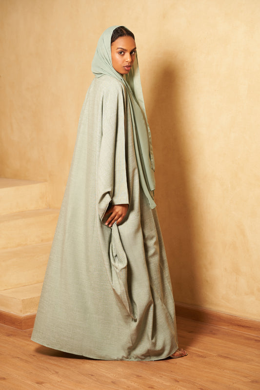 Plongez dans un océan de sérénité et de grâce avec notre Abaya SET LIN CHINÉ VERT. Conçue pour envelopper votre silhouette dans un confort ultime tout en évoquant une élégance intemporelle, cette abaya est un véritable chef-d'œuvre de simplicité et de raffinement.